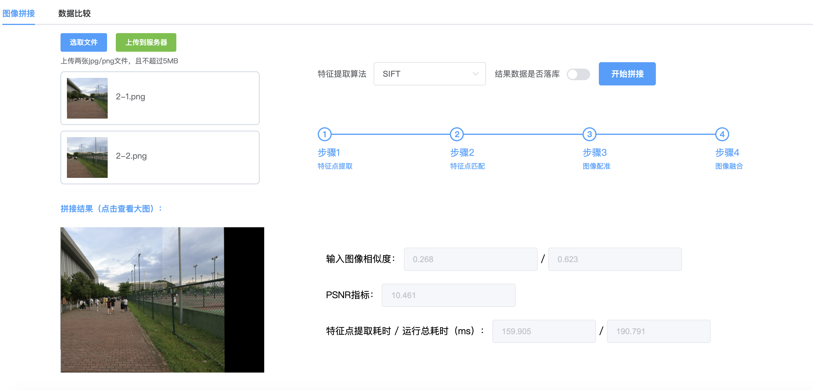 之前的博客中,已经介绍了图像拼接主要可以分为4个阶段:特征提取、特征匹配、图像配准、图像融合,其中特征提取阶段有SURF、SIFT、ORB、Harris等算法。于是我写了一个Web系统,用于使用不同的特征提取算法进行图像拼接,并且比较之间的效率和质量。